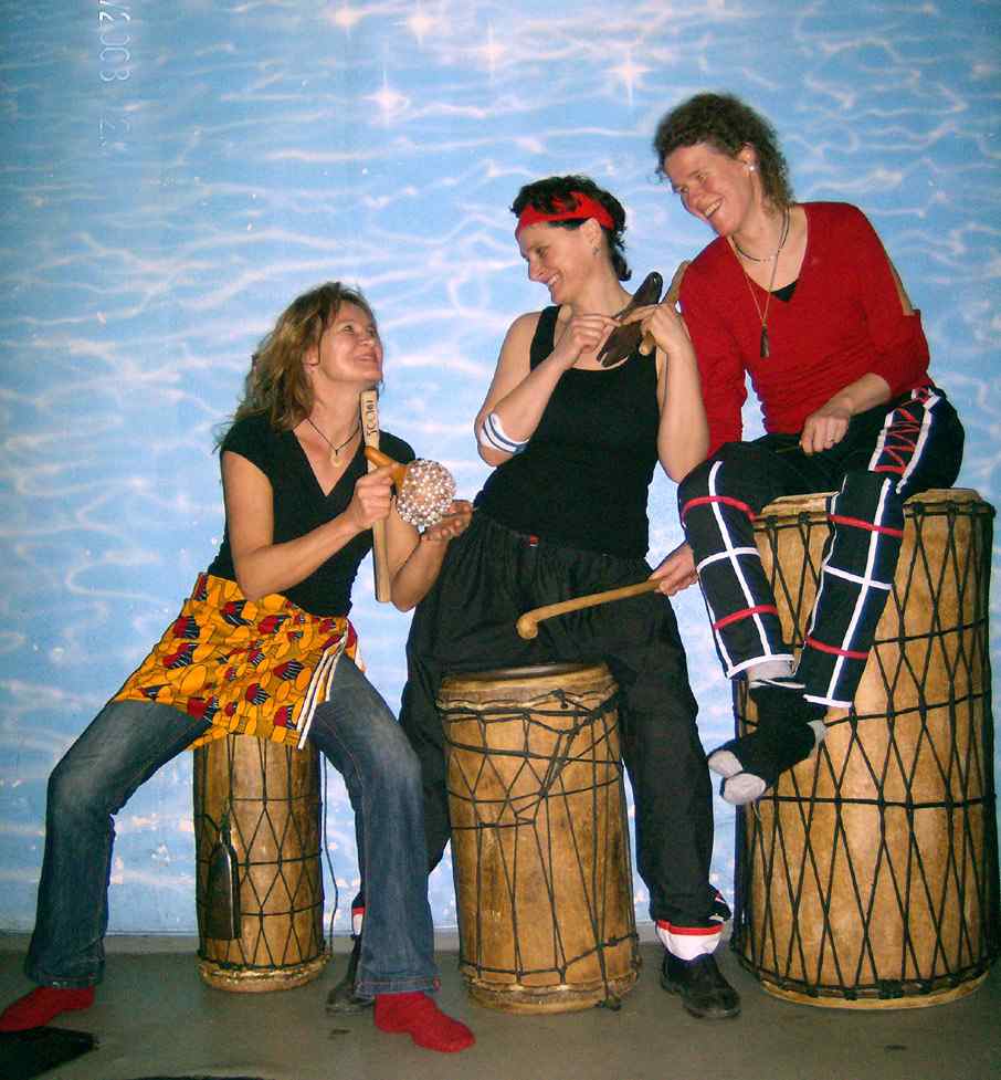 ......sind nicht nur Männer, nein – die Basstrommeln werden von drei energiegeladenen Frauen gespielt, die ihr Handwerk verstehen und den Männern das Feld für solistisches Djembe-Spiel eröffnen.